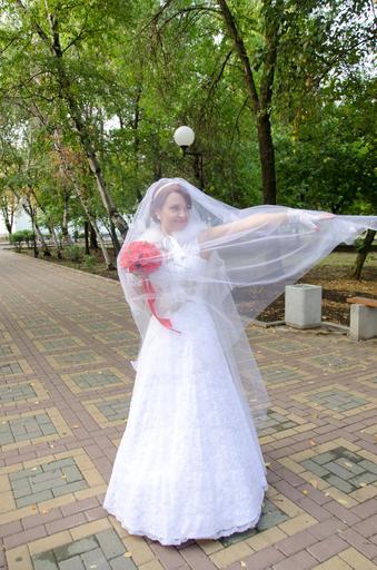 Keywords: wedding kiss the groom bride stroll just married dress happiness beauty green leaves outdoors sweethearts mood couple future love fata