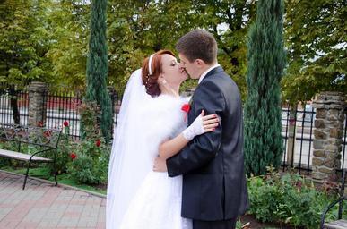 Keywords: wedding kiss the groom bride stroll just married dress happiness beauty green leaves outdoors sweethearts mood couple future love fata
