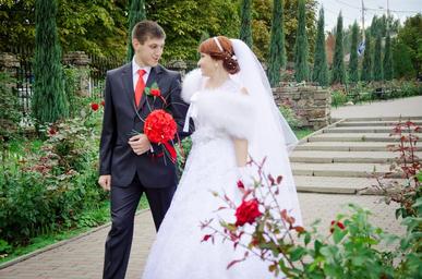 Keywords: wedding kiss the groom bride stroll just married dress happiness beauty green leaves outdoors sweethearts mood couple future love fata