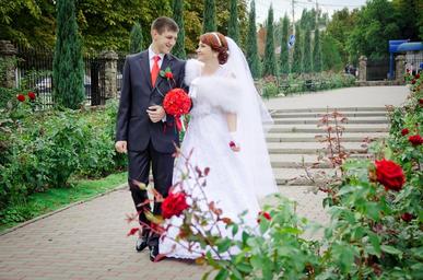 Keywords: wedding kiss the groom bride stroll just married dress happiness beauty green leaves outdoors sweethearts mood couple future love fata