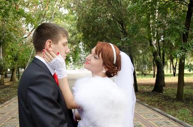 Keywords: wedding kiss the groom bride stroll just married dress happiness beauty green leaves outdoors sweethearts mood couple future love fata