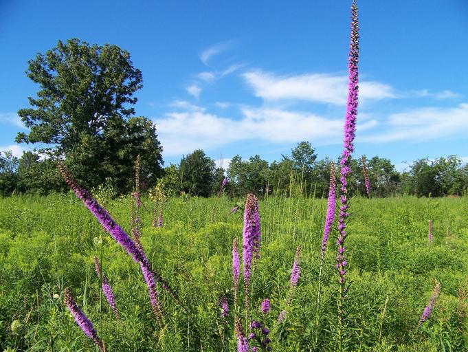 Keywords: weeds field purple flowers meadow environment landscape countryside flora blossom sunlight sky blue clouds