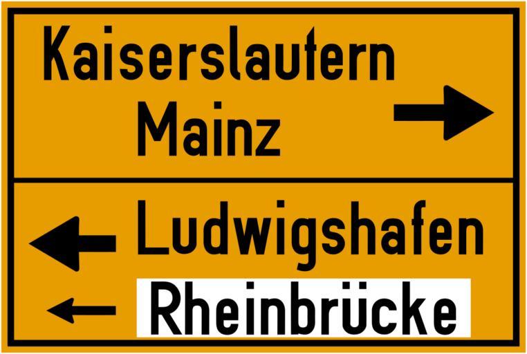 | Keywords: Wegweisertafel, nach 1956; die Tafel faßte alle Wegweiser einer Kreuzungszufahrt zusammen.svg de Wegweisertafel; die Tafel faßte alle Wegweiser einer_Kreuzungszufahrt zusammen Aufgrund der herzförmigen Pfeile und der relativ žmodernen Umsetzung der DIN 1451 wird diese aus mehreren Sperrholzlagen gefertigte Tafel möglicherweise erst nach 1966 aufgestellt worden sein Damals wurden die Tabellenwegweiser erstmals offiziell eingeführt Auch wenn die Umrahmung noch der 1953 bestätigten StVO von 1937 entspricht Die Buchstaben der Tafel waren aufgemalt die Pfeile bereits geklebt Für den Gelbton wurde zwischen 1942 und 1971 das RAL-Farbtonregister 840 R eingesetzt Der dort für Verkehrszeichen verzeichnete Gelbton ist in der Abbildung “ den RAL-Vorgaben entsprechend digital umgesetzt “ wiedergegeben Das Original der Tafel befand sich noch 2013 im Wormser Hafen im Einsatz Das Wort žLudwigshafen war zwischenzeitlich von einem allgemeinen Wegweiser zu Bundesautobahnen wie er zwischen 1968 und 1992 verwendet wurde weitgehend verdeckt worden Da der RAL-Ton des Autobahn-Wegweisers jedoch der Sonderfarbreihe RAL-F 7 entsprach kann der Wegweiser nur zwischen 1971 und 1992 angebracht worden sein own ; von einem sehr guten entzerrten Foto von 2013 abgezeichnet Mediatus 2013-11-02 v Cc-zero PD-VzKat Diagrams of historic road signs of Germany 1966 set SVG road signs in Germany |