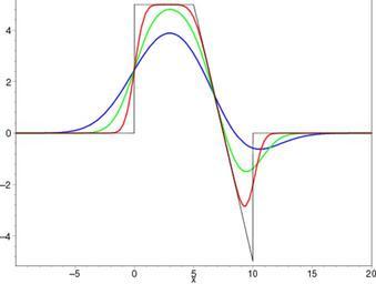 | Keywords: Weierstrass.png Weierstrass transforms for t 0 2 red t 1 green and t 3 blue The standard Weierstrass transfrom F x is the case t 1 the green graph Own AxelBoldt 2008-05 File was created with the following Maple 6 code <pre> > W f t x -> 1/sqrt 4 t Pi int f x-y exp -y 2/4/t y -infinity infinity ; > f x-> piecewise x<0 or x>10 0 x<5 5 5-2 x-5 ; > plotsetup ps plotoutput `weierstrass ps` plotoptions `width 8in height 6in portrait color noborder` ; > plot f x W f 0 2 x W f 1 x W f 3 x x -10 20 axes boxed color black red green blue thickness 2 3 3 3 ; </pre> and then converted from Postscript to PNG using GraphicsMagic Integral calculus Images with Maple source code |