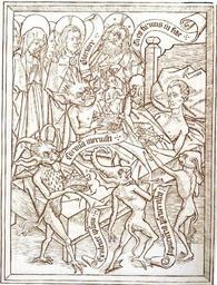 | Keywords: Weigel 07.JPG Artist Gloriare Tu es firmus in fide Coronam meruisti Exalta teipsum In paciencia perseuerasta perseverasti ---- Schriftbänder Sei stolz Du bist stark im Glauben Du hast die Krone verdient Verherrliche dich selbst Du bist in Geduld geübt ---- Banderoles Be proud You are strong in faith You have earned the crown Exalt yourself Persevere in patience Five devils adulate sanctimoniously and offer crowns Mary Christ and God the Father attend the dying man along with saints Three small figures of saved souls at his eye level show that pride can be resisted own PD-old Other versions left thumb Ars moriendi |