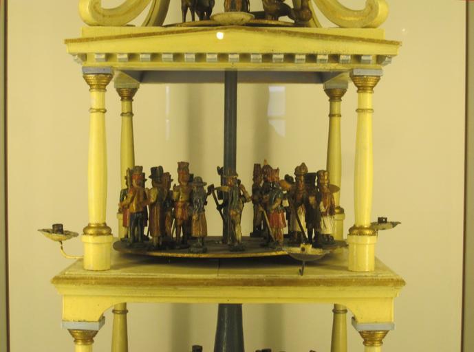 Keywords: Weihnachtspyramide Christmas pyramid from about 1830 4.jpg en Old Christmas pyramid from about 1830 - first half of the 19 century to be seen in the neo-classical architecture This is the middle part of the pyramid Figures of the Christmas story “ Holy kings Flight of Maria and Josef to Egypt angles soldiers also to be seen a scribe The figures have a size of about 15 to 18 centimetre - From Germany Ore Mountains Ore Mountain folk art crafted at Schoenheide in the Ore Mountains Now to be seen in the Brush- and Regional Museum at Schoenheide/Saxony de Weihnachtspyramide aus Schönheide im Erzgebirge ausgestellt im Schönheider Bürsten- und Heimatmuseum “ Mittlere Etage mit der Weihnachtsgeschichte Text der Beschriftung im Museum um 1830 gehört zu den ältesten erhaltenen Pyramiden des Erzgebirges Ca 60 geschnitzte Figuren Erste Etage Bergaufzug und Handwerker Zweite Etage Darstellung der biblischen Weihnachtsgeschichte Maria und Josef auf der Flucht nach Ägypten Engel Soldaten Schriftgelehrter ¦ 3 Etage Paradiesgärtlein mit Adam und Eva Baum mit Schlange exotischen Tieren Der 24 Dezember galt lange Zeit als Adam-und-Eva-Tag žDer klassische Drehturm aus Schönheide mit seiner Barockbekrönung mag auf die Zeit um 1830 zurückgehen Adolf Spamer Deutsche Volkskunst Sachsen Weimar 1954 žÃ„lteste geschnitzte Figuren des Bergaufzugs sind auf Pyramiden aus der ersten Hälfte des vergangenen Jahrhunderts gemeint ist das 19 Jahrhundert erhalten Claus Leichsenring Erzgebirgische Weihnachtspyramiden Dresden 1993 Seite 51 unter Hinweis auf die Abbildung der Schönheider Pyramide in dieser Veröffentlichung auf Seite 44 own Klaaschwotzer 2012-12-09 Christmas pyramids in Germany Ore Mountain folk art Christmas pyramid from about 1830 Cc-zero |
