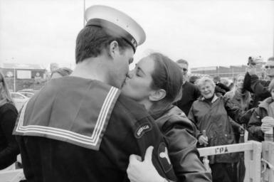 | Keywords: australian war memorial australianwarmemorial pork pie hat full rig uniform sailor cap kiss blackandwhite monochrome black and white Fremantle An unidentified marine technician from HMAS Darwin kisses his girlfriend at a homecoming ceremony for HMAS ANZAC and HMAS Darwin at Victoria Quay, Fremantle, WA. HMAS Darwin left Australia for the Persian Gulf on 28 October 2002, under Operation Slipper, Australia’s contribution to the international fight against terrorism, to participate in the Multinational Interception Force enforcing UN sanctions against Iraq. The Darwin was then assigned to Operation Bastille, the build-up of Australian forces against Iraq, in January 2003, and then to Operation Falconer, Australia’s contribution to the war on Iraq, in March 2003. The Task Group to which the Darwin was allocated was responsible for clearing the Khawr Abd Allah waterway. Rights Info: No known copyright restrictions. This photograph is from the Australian War Memorial's collection www.awm.gov.au Persistent URL: cas.awm.gov.au/photograph/P04192.123 Fremantle An unidentified marine technician from HMAS Darwin kisses his girlfriend at a homecoming ceremony for HMAS ANZAC and HMAS Darwin at Victoria Quay, Fremantle, WA. HMAS Darwin left Australia for the Persian Gulf on 28 October 2002, under Operation Slipper, Australia’s contribution to the international fight against terrorism, to participate in the Multinational Interception Force enforcing UN sanctions against Iraq. The Darwin was then assigned to Operation Bastille, the build-up of Australian forces against Iraq, in January 2003, and then to Operation Falconer, Australia’s contribution to the war on Iraq, in March 2003. The Task Group to which the Darwin was allocated was responsible for clearing the Khawr Abd Allah waterway. Rights Info: No known copyright restrictions. This photograph is from the Australian War Memorial's collection www.awm.gov.au Persistent URL: cas.awm.gov.au/photograph/P04192.123 |