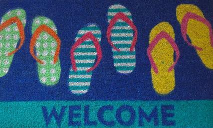 Keywords: welcome mat beach relax vacation chill out summer enter home blue casual bright color flip flop symbol fun design attitude travel comfort colorful tropical