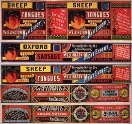 | Keywords: text bright The top three labels carry the Peach brand logo. All labels show an arrangement of text and lettering. No lithographer's name is recorded on the labels. Quantity: 5 colour art print(s) on labels.. Physical Description: Chromolithographs on labels, 105 x 330 mm; 53 x 330 mm; and, 50 x 330 mm. Provenance: Deposited by Gear Meat Company in 1981. Wellington Meat Export Co Ltd :[Five canned meat labels, for Sheep tongues (three different); Oxford sausage; and, Boiled mutton. 1890-1920].. Gear Meat Company :Scrapbook of labels. 1890s-1920s].. Ref: Eph-F-MEAT-Gear-058. Alexander Turnbull Library, Wellington, New Zealand. natlib.govt.nz/records/22871046 The top three labels carry the Peach brand logo. All labels show an arrangement of text and lettering. No lithographer's name is recorded on the labels. Quantity: 5 colour art print(s) on labels.. Physical Description: Chromolithographs on labels, 105 x 330 mm; 53 x 330 mm; and, 50 x 330 mm. Provenance: Deposited by Gear Meat Company in 1981. Wellington Meat Export Co Ltd :[Five canned meat labels, for Sheep tongues (three different); Oxford sausage; and, Boiled mutton. 1890-1920].. Gear Meat Company :Scrapbook of labels. 1890s-1920s].. Ref: Eph-F-MEAT-Gear-058. Alexander Turnbull Library, Wellington, New Zealand. natlib.govt.nz/records/22871046 |