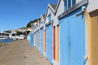 Keywords: wellington new zealand city center road blue building architecture home window door facade garage door housewife blue sky water summer holiday