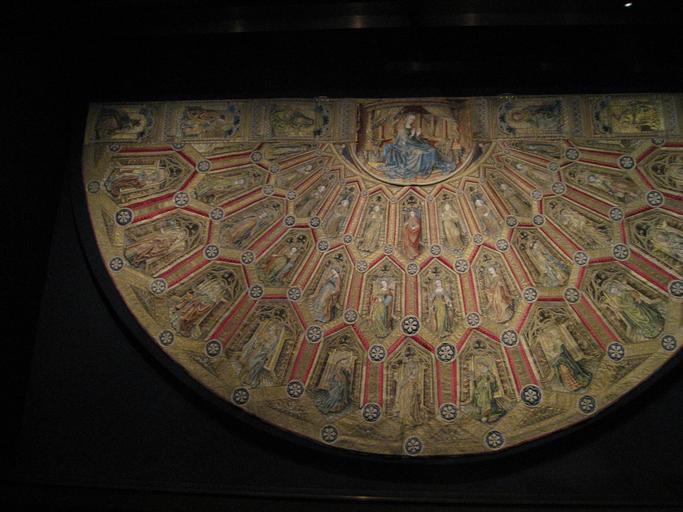 Keywords: Weltliche Schatzkammer Wien (238).JPG Der Messornat des Ordens vom Goldenen Vlies Der Marienmantel im Pluvialschild die Fürbittende im ratialen Kapellenkranz Himmelschöre von Engeln heiligen Jungfrauen Frauen und Witwen Gold- und Silberfäden in Anlegetechnik Stickerei mit Seide Perlen B 330 cm 164 cm lang KK Inv -Nr 21 The Liturgical Vestments of the Order of the Golden Fleece The Cope of the Virgin Mary Hood the Virgin as intercessor; concentric rows of chapels heavenly choirs of angels holy virgins women and widows Gold and silver thread in appliqué technique embroidery with silk and pearls W 330 cm L 164 cm KK Inv No 21 Own 2007-10 MyName Gryffindor part of panorama Weltliche Schatzkammer Wien 239 pano jpg Embroidered copes commissioned by Philip the Good |