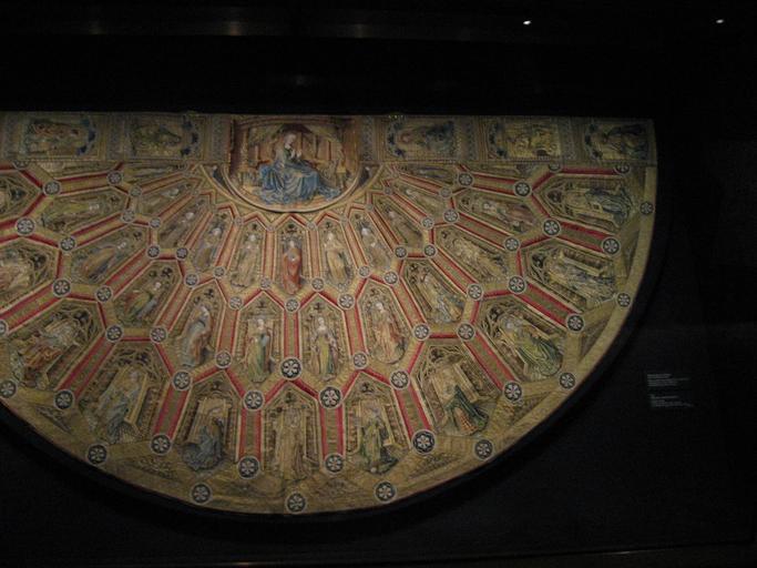Keywords: Weltliche Schatzkammer Wien (239).JPG Der Messornat des Ordens vom Goldenen Vlies Der Marienmantel im Pluvialschild die Fürbittende im ratialen Kapellenkranz Himmelschöre von Engeln heiligen Jungfrauen Frauen und Witwen Gold- und Silberfäden in Anlegetechnik Stickerei mit Seide Perlen B 330 cm 164 cm lang KK Inv -Nr 21 The Liturgical Vestments of the Order of the Golden Fleece The Cope of the Virgin Mary Hood the Virgin as intercessor; concentric rows of chapels heavenly choirs of angels holy virgins women and widows Gold and silver thread in appliqué technique embroidery with silk and pearls W 330 cm L 164 cm KK Inv No 21 Own 2007-10 MyName Gryffindor part of panorama Weltliche Schatzkammer Wien 239 pano jpg Embroidered copes commissioned by Philip the Good |