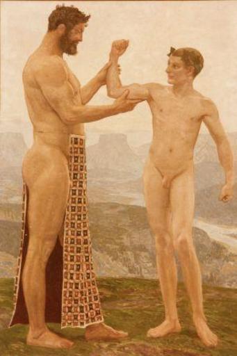 Keywords: Werdende Kraft (Schneider).jpg Artwork Creator Sascha Schneider 1904 oil canvas cm 200 138 Private collection Dreieich accession number object history credit line exhibition history http //stadtmuseum weimar de/index php id 127 Stadtmuseum Weimar PD-old-auto-1923 1927 Sascha Schneider Paintings of nude boys Ephebes Two males in art Nude standing boys in art