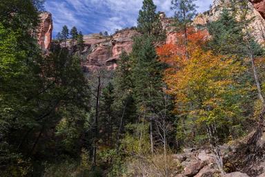 | Keywords: arizona coconino national forest coconinonationalforest forest service forestservice oak creek canyon oakcreekcanyon oak creek canyon vista oakcreekcanyonvista pentax k-1 pentaxk1 red rock ranger district redrockrangerdistrict red rock-secret mountain wilderness redrocksecretmountainwilderness sedona u.s. forest service usforestservice usfs west fork westfork west fork of oak creek canyon westforkofoakcreekcanyon autumn canyon fall fall color fallcolor fall colors fallcolors fall foliage fallfoliage forest hiking outdoors trail wilderness united states unitedstates outdoor The brilliant red, orange, and yellows of changing maple leaves mark the start of fall color in the West Fork of Oak Creek Canyon, October 12, 2016. There are a number of reasons why West Fork is one of the most popular trails on the Coconino National Forest. West Fork is fantastic throughout the year, but in autumn, the canyon is ablaze with color. Red and gold leaves float in clear reflecting pools along the creek, under a canopy of solid color. As for the trail itself, it's an easy stroll, but you do have to cross the stream in a number of places. Usually, that involves negotiating a few strategically placed stepping stones or taking a couple of steps in shallow water. The trail is marked and maintained for the first three miles. It ends at a deep pool in a narrow spot in the canyon. Parking is available at Call of the Canyon picnic site for a fee. This is a special fee site run by a concessionaire. Photo by Deborah Lee Soltesz, October 12, 2016. Credit: Coconino National Forest, U.S. Forest Service. Learn more about the West Fork of Oak Creek Canyon, Trail No. 108, Call of the Canyon picnic site, and the Coconino National Forest. The brilliant red, orange, and yellows of changing maple leaves mark the start of fall color in the West Fork of Oak Creek Canyon, October 12, 2016. There are a number of reasons why West Fork is one of the most popular trails on the Coconino National Forest. West Fork is fantastic throughout the year, but in autumn, the canyon is ablaze with color. Red and gold leaves float in clear reflecting pools along the creek, under a canopy of solid color. As for the trail itself, it's an easy stroll, but you do have to cross the stream in a number of places. Usually, that involves negotiating a few strategically placed stepping stones or taking a couple of steps in shallow water. The trail is marked and maintained for the first three miles. It ends at a deep pool in a narrow spot in the canyon. Parking is available at Call of the Canyon picnic site for a fee. This is a special fee site run by a concessionaire. Photo by Deborah Lee Soltesz, October 12, 2016. Credit: Coconino National Forest, U.S. Forest Service. Learn more about the West Fork of Oak Creek Canyon, Trail No. 108, Call of the Canyon picnic site, and the Coconino National Forest. |