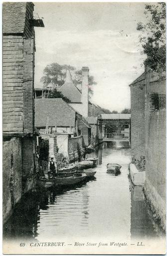 | Keywords: West Gate Towers 008.jpg Postcard of view north along River Stour from Westgate Canterbury Kent England postmarked 1908 There was a military museum inside the Westgate from 1908 My own scan of actual postcard 1908 Anon PD-old-70-1923 Canterbury West Gate River Stour Kent |