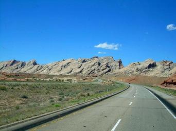 | Keywords: West I-70 through Utah approaching the San Rafael Reef.jpg Interstate 70 through Utah <br> View west Approaching the San Rafael Reef from the San Rafael Desert onto the en San Rafael Swell I-70 traverses east-west across the Swell which trends southwest-by-northeast The San Rafael Reef made of cliffs of en Navajo Sandstone is at the east border of the San Rafael Swell from the east the SR Reef extends southwest as the border between the Swell north and the San Rafael Desert southeast Own 2008-02-14 ErgoSum88 Interstate 70 in Utah San Rafael Reef San Rafael Desert San Rafael Swell Navajo Sandstone in Utah Navajo Sandstone |