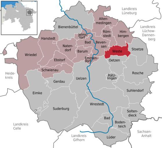 Keywords: Weste in UE.svg DeLocMaps Weste Weste Niedersachsen Landkreis Uelzen District of Uelzen Uelzen district L'arrondissement d'Uelzen Arrondissement d'Uelzen Niedersachsen Lower Saxony Basse-Saxe TUBS/Translation Adobe Illustrator <br/> based on <br/> File Lower Saxony location map svg NordNordWest<br/> http //www geodaten niedersachsen de/master/C17415881_N17416128_L20_D0_I15258844 htm Niedersachsen Viewer<br/> http //www geomdk niedersachsen de/data/lgn/info/dgm5_lk360 pdf Koordinierungsstelle GDI-NI beim Landesbetrieb Landesvermessung und Geobasisinformation Niedersachsen DGM 5 Verfügbarkeit Landkreis/Stadt Landkreis Uelzen<br/> File Locator map UE in Lower Saxony svg TUBS 2010-10-05 Hagar66 based on work of TUBS Hagar66/licensesection Attribution TUBS/Credits Locator maps of municipalities in Landkreis Uelzen Weste |