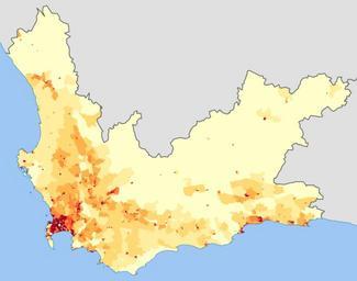 | Keywords: Western Cape 2011 population density map.svg ffffcc <1 inhabitant/km² ffeda0 1 “3 inhabitants/km² fed976 3 “10 inhabitants/km² feb24c 10 “30 inhabitants/km² fd8d3c 30 “100 inhabitants/km² fc4e2a 100 “300 inhabitants/km² e31a1c 300 “1000 inhabitants/km² bc0026 1000 “3000 inhabitants/km² 800026 >3000 inhabitants/km² Projection is Albers Equal-Area Conic with standard parallels at 25 5° S and 31 5° S and origin at 28 5° S 25 5° E Statistics South Africa's Census 2011 is the source of the basic population data The map results from my own processing of the data Htonl 2013-10-22 http //beta2 statssa gov za/ page_id 425 The following license applies to the population data on which the map is based the user acknowledges Stats SA as the source of the basic data wherever they process apply utilise publish or distribute the data and also that they specify that the relevant application and analysis where applicable result from their own processing of the data The following tag applies to the map itself Demographic maps of South Africa Maps of the Western Cape |