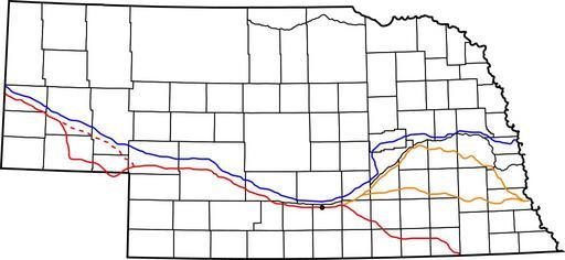 | Keywords: Western Trails in Nebraska.svg Western trails in Nebraska Blue Mormon Trail; red Oregon Trail/California Trail/Pony Express; dashed red Oregon Trail/California Trail; orange lesser-used trail routes; black dot Fort Kearny self-made Trails adapted from http //www nebraskatransportation org/maps/state-map/current/pdf/front pdf Nebraska Department of Roads highway map 2008-03-31 Swid History of Nebraska Maps of Nebraska Mormon Trail Oregon Trail Trails in the United States Pony Express Maps related to Mormonism |