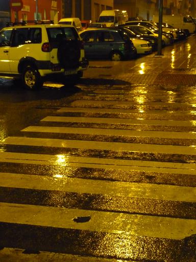 Keywords: wet rain water pedestrian crossing calzada brightness damp moisture rainy night city highlights firm urban cars