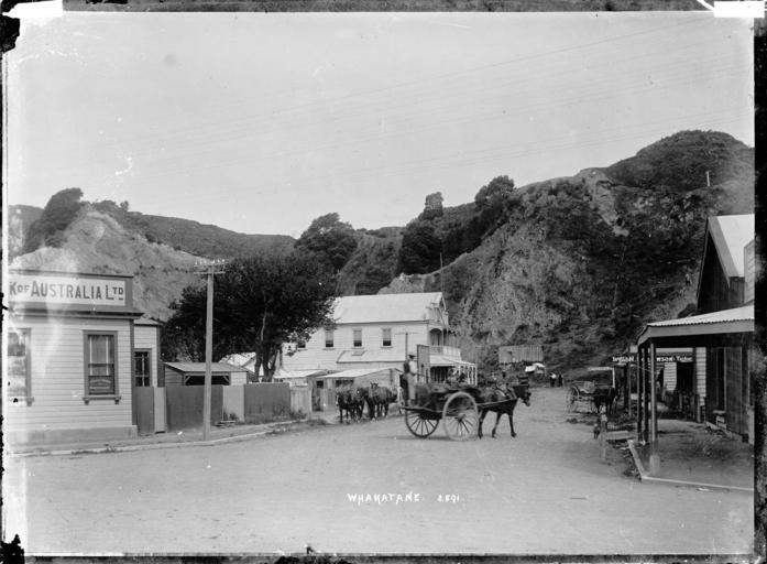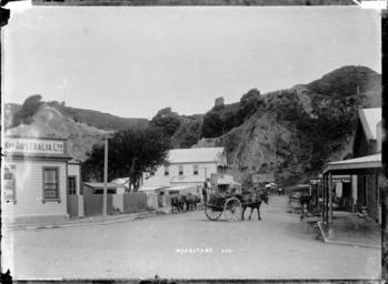| Keywords: blackandwhite monochrome outdoor photo border building architecture black and white Whakatane township and rocky cliffs behind, photographed by William Archer Price circa 1910s. Looks along a street with shops on the right, a horse and cart in the centre, a two-storeyed building with verandahs facing the road, and a corner of the Union Bank of Australia on the left. Inscriptions: Inscribed - Photographer's title on negative -bottom centre: Whakatane. 2591. Quantity: 1 b&w original negative(s). Physical Description: Dry plate glass negative Whakatane township. Price, William Archer, 1866-1948 :Collection of post card negatives. Ref: 1/2-001775-G. Alexander Turnbull Library, Wellington, New Zealand. natlib.govt.nz/records/23231786 Whakatane township and rocky cliffs behind, photographed by William Archer Price circa 1910s. Looks along a street with shops on the right, a horse and cart in the centre, a two-storeyed building with verandahs facing the road, and a corner of the Union Bank of Australia on the left. Inscriptions: Inscribed - Photographer's title on negative -bottom centre: Whakatane. 2591. Quantity: 1 b&w original negative(s). Physical Description: Dry plate glass negative Whakatane township. Price, William Archer, 1866-1948 :Collection of post card negatives. Ref: 1/2-001775-G. Alexander Turnbull Library, Wellington, New Zealand. natlib.govt.nz/records/23231786 |