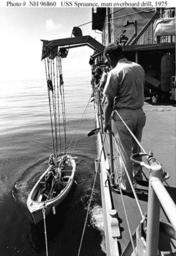 | Keywords: Whaleboat Spruance NHHC h96860.jpg en USS Spruance DD-963 Crewmen lower a 26-foot motor whaleboat for a man overboard drill during the ship's shakedown cruise in the Gulf of Mexico Autumn 1975 http //www history navy mil/photos/sh-usn/usnsh-s/dd963h htm Photograph was received in November 1975 Naval Historical Center http //www history navy mil/photos/images/h96000/h96860 jpg Photo NH 96860 PH1 Lonnie M McKay 1975 PD-USGov-Military-Navy Motor whaleboats Naval ships of the United States USS Spruance DD-963 Man overboard drills |