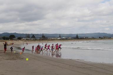 Keywords: whangamata new zealand north island beach landscape nature water forest sea lifeguard on duty children run race active swim save learn teaching exercise cloudiness clouds grey summer