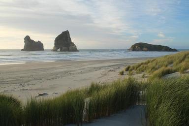 Keywords: Wharariki Beach and Archway Islands.jpg Wharariki Beach and Archway Islands all three larger islands of the Archway Islands in view Own 2015-04-15 Pseudopanax wikipedia en 40 30 16 9 S 172 40 26 1 E Wharariki Beach