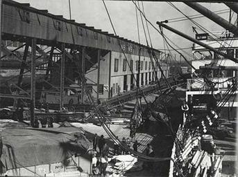 | Keywords: archives state records nsw staterecordsnsw newsouthwales blackandwhite wharf glebe island glebeisland sydney grain ship monochrome black and white Grain being loaded onto a ship by a portable conveyor belt at wharf No.8-9, Glebe Island Dated: c.1937 Digital ID: 9856_a017_A017000079 Rights: www.records.nsw.gov.au/about-us/rights-and-permissions We'd love to hear from you if you use our photos. Many other photos in our collection are available to view and browse on our website using Photo Investigator. Grain being loaded onto a ship by a portable conveyor belt at wharf No.8-9, Glebe Island Dated: c.1937 Digital ID: 9856_a017_A017000079 Rights: www.records.nsw.gov.au/about-us/rights-and-permissions We'd love to hear from you if you use our photos. Many other photos in our collection are available to view and browse on our website using Photo Investigator. |