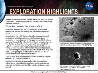 | Keywords: What lies beneath the lunar surface? DVIDS832714.jpg The LRO Camera LROC continues to reveal contrasting materials weathering out of slopes or being uncovered by impact events In the upper image black patches appear on the wall of a volcanic rille which is a narrow channel The darkest spots on the moon are usually associated with explosive volcanic materials called pyroclastics but these are blocky and uneven unlike other identified pyroclastic deposits The bottom image is a collapsed lava tube or pit 90 m deep and wide Future geologists could explore lava tubes like this to understand what lies beneath the surface Time Frame Both images were acquired by LROC during the ongoing LRO Exploration Mission Application Identifying regions where the complex lunar subsurface is exposed will enable future explorers to sample materials and better understand the way the landscape was formed NASA Identifier 452642main_2010-17A 2010-06-04 Glenn Research Center https //www dvidshub net/image/832714 832714 2013-02-08 02 40 WASHINGTON D C US PD-USGov Images from DoD uploaded by Fæ check needed Images from DoD uploaded by Fæ Lunar surface What lies beneath the lunar surface? DVIDS832714.jpg The LRO Camera LROC continues to reveal contrasting materials weathering out of slopes or being uncovered by impact events In the upper image black patches appear on the wall of a volcanic rille which is a narrow channel The darkest spots on the moon are usually associated with explosive volcanic materials called pyroclastics but these are blocky and uneven unlike other identified pyroclastic deposits The bottom image is a collapsed lava tube or pit 90 m deep and wide Future geologists could explore lava tubes like this to understand what lies beneath the surface Time Frame Both images were acquired by LROC during the ongoing LRO Exploration Mission Application Identifying regions where the complex lunar subsurface is exposed will enable future explorers to sample materials and better understand the way the landscape was formed NASA Identifier 452642main_2010-17A 2010-06-04 Glenn Research Center https //www dvidshub net/image/832714 832714 2013-02-08 02 40 WASHINGTON D C US PD-USGov Images from DoD uploaded by Fæ check needed Images from DoD uploaded by Fæ Lunar surface |