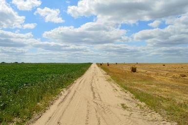 Keywords: wheat field agriculture harvesting straw bale a pile yellow farm stack sky road country green