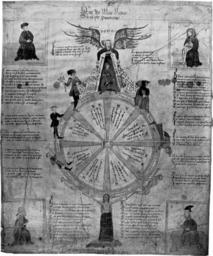 | Keywords: Wheel-of-life-la-roe-de-mere-nature-forrer-c1400.jpg Old French and was formerly in the collection of Robert Forrer It was auctioned in 1911 but its current location is unknown The title is La Roue de Mere Nature Sa Ceste Pourtraiture The Wheel of Mother Nature This is Her Image Mother Nature is at the bottom a young woman with long blond hair standing on a flowered hillock Naked from the waist up she wears a blue pleated skirt and white gloves and holds the wheel overhead It is a Wheel of Life from infancy to old age showing the seven Ages of Man and Death a skeletal reaper The word generatio is written by her right hand below the child indicating the rising side of the wheel while corruptio is written by her left hand beneath Death and referring to the declining side The seven canonical hours are written around the rim of the wheel Between the eight spokes of the wheel are questions in verse which are answered in the quatrains on either side of the wheel The four figures in the corners of the page are each associated with a 12-line text Atop the wheel is a striking allegory of Time a winged woman with three faces wearing a blue dress Her faces are labeled Past Present and Future Her four wings are the seasons with the months as feathers She pours the sands of time from two vials The outpouring on the left is labeled Day Douceur a ceulx chy je abandone while the right is labeled Night Amertune a ceux chy je donne Heidelberg Univ http //digi ub uni-heidelberg de/diglit/boerner1911_12_04/0058 The artist is unknown circa 1400 PD-old-100 PD-1996 <gallery> File Wheel-of-life-mother-nature-forrer-french-c1400 jpg Smaller version </gallery> Robert Forrer 14th-century works in France Allegories Ages of man Personifications of time Personifications of nature Personifications of death Allegories of the seasons Months in art Wheels in art |
