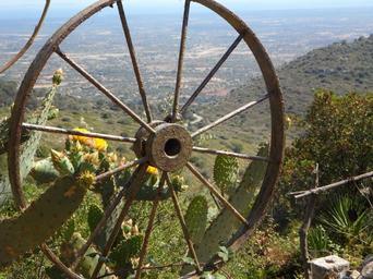 Keywords: wheel spokes wagon wheel vision outlook metal landscape mediterranean