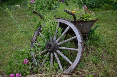 Keywords: wheel wheelbarrow gardening build flowers rusty wood transport