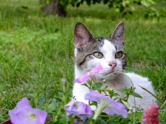 Keywords: white cat kitty kitten blaze garden purple lilac petunias gardening green grass tree outside spring summer feline pet animal nature pretty floral flowering