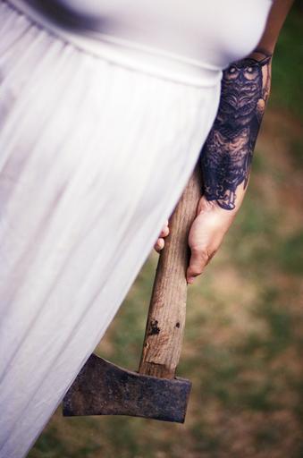 Keywords: white dress axe tattoo horror scary white weapon dress angry hatchet handle clothing frustrated woman