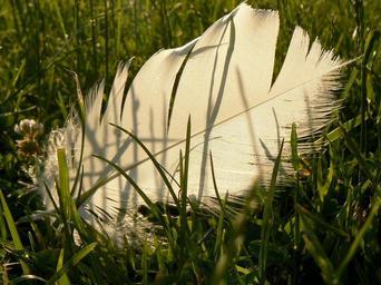 Keywords: white feathers fallen grasses greenery green background birds plumage delicate soft bright sunny day sunlight nature flora fauna still life environment