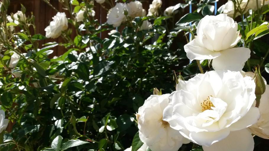 Keywords: white roses rose bush flower white green spring garden floral day plant natural