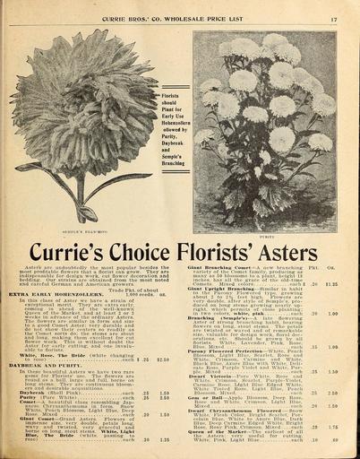 | Keywords: Wholesale price list (15754878543).jpg CURRIE BROS ' CO WHOLESALE PRICE LIST <br> 17 <br> Florists <br> should <br> Plant for <br> Early Use <br> Hohenzollern <br> olio wed by <br> Purity <br> Daybreak <br> and <br> Semple's <br> Branchiag <br> SKMPLE S ERANi HlNi; <br> Currie's Choice <br> Asters are undoubtedly the most popular besides the <br> most profitable flowers that a florist can grow They are <br> indispensable for design work cut flower decoration and <br> bedding Our strains are obtained from the most noted <br> and careful German and American growers <br> Trade Pkt of about <br> BXTRA EARLY HOHENZOLLERN 1 000 seeds OZ <br> In this class of Aster we have a strain of <br> exceptional merit They are extra early <br> coming in ahead of the well-known <br> Queen of the Market and at least 2 or 3 <br> weeks in advance of the ordinary Asters <br> The flowers are similar in form and size <br> to a good Comet Aster; very durable and <br> do not show their centers so readily as <br> the Comet sorts do; the stems are stout <br> and long making them excellent for cut <br> flower work This is -without doubt the <br> Aster for early cutting and one invalu- <br> able to florists <br> White Rose The Bride white changing <br> to rose each 25 2 50 <br> DAYBREAK AND PURITY <br> In these beautiful Asters we have two rare <br> gems for Florists' use The flowers are <br> round as a ball large and full borne on <br> long stems They are continuous bloom- <br> ers and desirable acquisitions <br> Daybrealt Shell Pink each 25 1 50 <br> Purity Pure White each 25 2 50 <br> Comet A beautiful class resembling Jap- <br> anese Chrysanthemums in form Snow <br> White Peach Blossom Light Blue Deep <br> Rose iVIixed each 20 1 50 <br> Giant Comet Grand Asters Flowers of <br> immense size very double petals long <br> wavy and twisted very graceful and <br> borne on long stout stems White Light <br> Blae The Bride white passing to <br> rose each 20 1 25 <br> Florists' Asters <br> Giant BraDChing Comet- A new branching Pkt Oz <br> variety of the Comet family producing as <br> many as 50 blossoms to a plant height 18 <br> inches has all the grace of the old-time <br> Comets Mixed colors each 20 1 25 <br> Giant Upright Brandling Similar in habit <br> to the Paeony Flowered type gro wing <br> about 2 to 2 feet high Flowers are <br> very double after stj'le of Semple's pro- <br> duced on long stems growing nearly up- <br> right which permits of close planting; <br> in two colors vliite pink each 20 1 00 <br> Branching Seinples A late flowering <br> Aster of strong branching habit bearing <br> flowers on long stout stems The petals <br> are twisted or waved and of remarkable <br> size valuable for design work floral dec- <br> orations etc Should be grown by all <br> florists White Lavender Pink Rose <br> Blue Mixed each 15 1 0 k <br> Paeony PloTvered Perfection White Peach <br> Blossom Light Blue Scarlet Rose and <br> White Crimson Carmine and White <br> Black Blue Azure Blue with White Deli- <br> cate Rose Purple Violet and White Pur- <br> ple Mixed each 25 1 50 <br> Dwarf Victoria Pure White Rose and <br> White Crimson Scarlet Purple-Violet <br> Carmine Rose Light Blue Edged White <br> White Tinted Rose Light Blue Peach <br> Blossom Mixed each 25 2 50 <br> Gem or Ball Apple Blossom Deep Rose <br> Rose and White Crimson Light Blue <br> Mixed each 20 1 50 <br> Dwarf Chrysanthesnum Flowered SnOTV <br> White Flesh Color Bright Scarlet Por- <br> celain Blue White to Azure Blue Dark <br> Blue Deep Carmine Edged White Bright <br> Rose Rosy Pink Crimson Mixed each 25 1 75 <br> lueen of the Market The earliest of all <br> the Asters; very useful for cutting <br> White Pink Light Blue each 10 60 42212818 133036 66130 Page 17 Text http //www biodiversitylibrary org/page/42212818 1905 10 5962/bhl title 66130 Currie Brothers Company ; Henry G Gilbert Nursery and Seed Trade Catalog Collection NameFound Victoria NameConfirmed Victoria EOLID 34123 NameBankID 897688 Biodiversity Heritage Library Currie Bros Co Wholesale price list autumn 1905 Garden Stories Bulbs Plants Catalogs Equipment and supplies Flowers Gardening Nurseries Horticulture Plants Ornamental Seeds U S Department of Agriculture National Agricultural Library bhl page 42212818 dc identifier http //biodiversitylibrary org/page/42212818 bhlGardenStories BHLinbloom bulbs plants nurseries horticulture plants ornamental u s department of agriculture national agricultural library bhlgardenstories bhlinbloom Information field Flickr posted date ISOdate 2015-01-26 CC-BY-2 0 BioDivLibrary https //flickr com/photos/61021753 N02/15754878543 2015-08-25 05 52 49 cc-by-2 0 PD-old-70-1923 Wholesale price list Photos uploaded from Flickr by FĂŚ using a script |