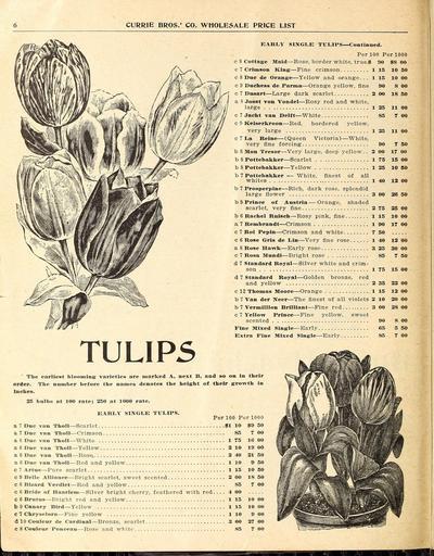 | Keywords: Wholesale price list (16187472460).jpg CURRIE BROS ' CO WHOLESALE PRICE LIST <br> TU LI PS <br> EARLY SINGLE TULIPS Continued <br> Per 100 Per 1000 <br> c 8 Cottage Maid Rose border white true 90 58 00 <br> c 7 Crimson King Fine crimson 1 15 10 50 <br> c 8 Dnc dc Orange Yellow and orange 1 15 10 00 <br> c 9 Duchess de Parma Orange yellow fine 90 8 00 <br> c 7 Dnsart Large dark scarlet 2 00 18 50 <br> a 8 Joost Ton Vondel Rosy red and white <br> large 1 25 11 00 <br> c 7 Jacht van Delft White 85 700 <br> c 9 Keiserkroon Red bordered yellow <br> very large 1 25 11 00 <br> c 7 La Heine Queen Victoria White <br> very fine forcing 90 7 50 <br> b 8 3Ion Tresor Very large deep yellow 2 00 17 00 <br> b 8 Pottebaklter Scarlet 1 75 15 00 <br> b 8 Pottebakker Yellow 1 25 10 60 <br> b 7 Pottebakker White finest of all <br> whites 1 40 12 00 <br> b 7 Prosperpine Rich dark rose splendid <br> large flower 3 00 26 50 <br> b 9 Prince of Austria Orange shaded <br> scarlet very fine 2 75 25 00 <br> b 6 Rachel Rulsch Rosy pink fine 1 15 10 00 <br> a 7 Rembrandt Crimson 1 90 17 00 <br> c 7 Roi Pepin Crimson and white 7 50 <br> c 6 Rose Gris de Lin Very fine rose 1 40 12 00 <br> a 8 Rose Hawk Early rose 3 25 30 00 <br> c 7 Rosa Mundi Bright rose 85 7 50 <br> d 7 Standard Royal Silver white and crim- <br> son 1 75 15 00 <br> d 7 Standard Royal Golden bronze red <br> and yellow 2 35 22 00 <br> c 12 Thomas Moore Orange 1 15 12 00 <br> b 7 Van der Neer The finest of all violets 2 10 20 00 <br> b 7 Vermillion Brilliant Pine red 3 00 28 00 <br> c 7 Yellotv Prince Fine yellow sweet <br> scented 90 8 00 <br> Fine Mixed Single Early 65 5 50 <br> Extra Fine Mixed Single Early 85 7 00 <br> ' The earliest blooming varieties are marked A next B and so on in their <br> order Tlie number before the names denotes the height of their growth in <br> Inches <br> 25 bulbs at 100 rate; 250 at 1000 rate <br> EARLY SINGLE TULIPS <br> Per 100 Per 1000 <br> a 7 Due van Tholl Scarlet 1 10 9 50 <br> a 7 Due van Tlioll Crimson 85 7 00 <br> a 6 Due van Tholl White 1 75 16 00 <br> a 6 Due van Tholl Yellow 2 10 19 00 <br> a 6 Due van Tholl Ros 2 40 21 50 <br> a 6 Due van ThoU Red and yellow 1 10 9 50 <br> c 7 Artus -Pure scarlet 1 15 10 50 <br> c 9 Belle Alliance Bright scarlet sweet scented 2 00 18 50 <br> C 6 Bizard Verdict Red and yellow 85 7 00 <br> c 6 Bride of Haarlem Silver bright cherry feathered with red 4 00 <br> C 6 Brutus Bright red and yellow 1 15 10 00 <br> b 9 Canary Bird Yellow 1 15 10 00 <br> C 7 Chryselora Fine yellow 1 10 9 00 <br> d 10 Coulcur de Cardinal Bronze scarlet 3 00 27 00 <br> c 8 Couleur Ponceau Rose and w hite 85 7 00 <br> W <br> I I'l HUi II <br> iili 42212829 133036 66130 Page 6 Text http //www biodiversitylibrary org/page/42212829 1905 10 5962/bhl title 66130 Currie Brothers Company ; Henry G Gilbert Nursery and Seed Trade Catalog Collection NameFound Brutus Biodiversity Heritage Library Currie Bros Co Wholesale price list autumn 1905 Garden Stories Bulbs Plants Catalogs Equipment and supplies Flowers Gardening Nurseries Horticulture Plants Ornamental Seeds U S Department of Agriculture National Agricultural Library bhl page 42212829 dc identifier http //biodiversitylibrary org/page/42212829 bhlGardenStories BHLinbloom bulbs plants nurseries horticulture plants ornamental u s department of agriculture national agricultural library bhlgardenstories bhlinbloom Information field Flickr posted date ISOdate 2015-01-26 CC-BY-2 0 BioDivLibrary https //flickr com/photos/61021753 N02/16187472460 2015-08-25 05 54 12 cc-by-2 0 PD-old-70-1923 Wholesale price list Photos uploaded from Flickr by FĂŚ using a script |