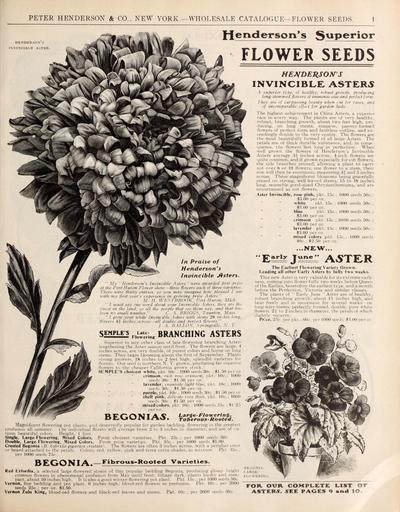 | Keywords: Wholesale price list of requisites for florists and market gardeners (16750687756).jpg PETER HENDERSON CO NEW YORK WHOLESALE CATALOGUE FLOWER SEEDS 1 <br> HENDERSON s <br> INVINCIBLE ASTER <br> H enderson's S uperior <br> FLOWER SEEDS <br> HENDERSON'S <br> INVINCIBLE ASTERS <br> 4 superior type of healthy robust growth producing <br> long- stemmed flowers of immense size and perfect form <br> They are of surpassing beauty when cut for vases and <br> of incomparable effect for garden beds <br> The highest achievement in China Asters a superior <br> race in every way The plants are of very healthy <br> robust branching growth about two feet high pro- <br> ducing on long stems massive paeony-formed <br> flowers of perfect form and faultless outline and ex- <br> ceedingly double to the very centre The flowers are <br> the most beautifully formed of all large Asters The <br> petals are of thick durable substance and in conse- <br> quence the flowers last long in perfection When <br> well grown the flowers of Henderson's Invincible <br> Asters average 3i inches across; 4-inch flowers are <br> quite common and if grown especially for cut flowers <br> the side branches pruned allowing a plant to carry <br> not over 8 or 10 flowers one flower to a stem their <br> size will then be enormous measuring 44 and 5 inches <br> across These magnificent blossoms being gracefully <br> poised on strong well-leaved Stems 15 to 18 inches <br> long resemble good-sized Chrysanthemums and are <br> unsurpassed as cut flowers <br> Aster Invincible rose pink pkt 15c; 1000 seeds 50c ; <br> 3 00 per oz <br> white pkt 15c; 1000 seeds 50c; <br> 13 00 per oz <br> blue pkt 15c; 1000 seeds 50c; <br> 3 00 per oz <br> crimson pkt 15c; 1000 seeds 50c; <br> 3 00 per oz <br> lavender pkt 15c; 1000 seeds 50c; <br> 3 00 per oz <br> mixed colors pkt 15c; 1000 seeds <br> 40c; 2 50 per oz <br> In Praise of <br> Henderson's <br> Invincible Jfsters <br> \Iv ' Henderson's Invincible Asters ' were awarded first prize <br> at the Port Huron Flower show three flowers each of three varieties <br> There were thirty entries so you may imagine how pleased I am <br> with my first year's experience in growing prize Asters <br> M H WESTBROOK Port Huron Mich <br> I must say one word about your Invincible Asters they are the <br> finest in the land so all the people that see them say and that has <br> been no small number C A BRIGGS Taunton Mass <br> I greu' your white Invincible Asters with stems 28 inches long <br> flowers i\ inches across all double and perfect flowers <br> J A B ALLOX Springville X V <br> BRANCHING ASTERS <br> Superior to any other class of late-flowering branching Aster- <br> lengthening the Aster season until frost The flowers are large 4 <br> inches across are very double of purest colors and borne on long <br> stems They begin blooming about the first of September Plants <br> strong growers 18 inches to 2 feet high splendid varieties <br> florists Our seed is northern N Y grown producing far superior <br> flowers to the cheaper California grown stock <br> SEMPLE'S choicest white pkt 10c; 1000 seeds 30c ; 1 50 peroz <br> crimson rich rose crimson pkt 10c looo <br> seeds 30c; 1 50 per oz <br> lavender exquisite light blue pkt 10c ; 1000 <br> seeds 30c; 1 50 per oz <br> purple pkt 10c; 1000 seeds 30c; 1 50 per oz <br> shell pink delicate rosy flesh pkt Hie ; 1011 1 <br> seeds 30c; 1 50 per oz <br> mixed colors pkt 10c; 1000 seeds 25c; 1 25 <br> BEGONIAS <br> Large-- Flowering <br> Tuberous- Rooted <br> Magnificent flowering pot plants anil deservedly popular for garden bedding flowering in the greatest <br> profusion all summer 1 he individual florets will average from 2 to 3 inches in diameter and are of va <br> rious beautiful colors Height 1 foot <br> Single Large- Flowering Mixed Colors From choicest varieties Pkt 26c per loon seeds 50c <br> Double Large Flowering Mixed Colors From prize varieties Pkt 35c per 1 000 seeds 1 00 <br> Crested Begonia B hybrida gigantea cristatai The flowers are often 3 inches across with a peculiat i n <br> or beard attached to the petals Colors red yellow pink and terra cotta shades in mixture Pkt 35c ; <br> per 1000 seetls 75c <br> BEGONIA Fibrous-Rooted Varieties <br> Red Erfordia a selected large- flowered strain of this popular bedding Begonia producing glos- \ 1 right <br> crimson flowers in phenomenal profusion from May until frost; foliage dark plants bushy and com- <br> pact about 10 inches high It is also a good winter- flowering pot plant Pkt 15c ; per 1 001 1 see Is 50c <br> Vernon fine bedding and pot plant 1 inches high blood-red flowers in prolusion Pkt 10c; per 2000 <br> seeds 25c; per oz 3 50 <br> Vernon Zulu King blood-red flowers and black-red leaves and stems Pkt 10c ; per 2000 seeds 50c <br> ’ ’ ’ E V ’ <br> jT Β»riy J <br> vine <br> ASTER <br> The Earliest Flowering Variety Grown <br> Leading all other Early Asters by fully two weeks <br> This new Aster is very valuable for its extreme earli- <br> ness coming into flower fully two weeks before Queen <br> of the Earlies heretofore the earliest type and a month <br> before the Perfection Victoria and similar classes <br> The plants of Early June Aster are of healthy <br> robust branching growth about 15 inches high and <br> bear freely and in succession for several weeks on <br> long wirv stems perfectly formed double pure white <br> flowers 2' to 2 inches in diameter the petals of which <br> slightly recurve <br> Price 25c per pkt ; Hie per 1000 seeds 3 00 peroz <br> BEOON v <br> LARGS- <br> I'l O WBHIN <br> FOR OUR COMPLETE LIST OT <br> ASTERS SEE PAGES 9 ana lO 45173696 160879 84546 Page 1 Text http //www biodiversitylibrary org/page/45173696 1908 Henderson Peter Co ; Stumpp Walter Co New York N Y Biodiversity Heritage Library Wholesale price list of requisites for florists and market gardeners / 1897-1913 Garden Stories Catalogs Henderson Peter Co New York New York State Nurseries Horticulture Nu