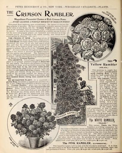 | Keywords: Wholesale price list of requisites for florists and market gardeners (16750610676).jpg 6 <br> PETER HENDERSON CO NEW YORK WHOLESALE CATALOGUE PLANTS <br> Hi Crimson Rambler <br> Magnificent Pyramidal Clusters of Rich Crimson Roses <br> EVERY CLUSTER A PERFECT BOUQUET OF ROSES IN ITSELF <br> This grand Rose improves upon acquaintance ; the better it is known the <br> more popular it becomes We have occasionally to modify opinions formed <br> of the value of new Roses but the Crimson Rambler is one that we <br> offer to our customers after an extended trial with greater confidence in <br> its merits It came to this country heralded as a wonder among flowers <br> but the most extravagant praises yet bestowed on it fall short of doing <br> it ample justice It is adapted to the entire country and should be in <br> every garden in America See cut <br> THE PRIZES IT WON The judges at one of <br> the principal flower shows in England when award- <br> it a Gold Medal the highest honor they could bestow <br> epitomized the views of all who had seen it when <br> they said that the ordinary premiums reserved for <br> new Roses of the highest grade were entirely inad- <br> equate to indicate the merits of the Crimson Ram- <br> bler At every exhibition throughout Great Britain <br> where it was shown it received the highest honors <br> and this opinion was endorsed The National Rose <br> Society of England the National Horticultural Society <br> of France and the International Exposition awarded <br> Gold Medals to Crimson Rambler <br> ITS GROWTH It is of rapid vigorous growth <br> plants in our ground attained a height of fifteen feet <br> the past season The flowers are produced m trusses <br> pyramidal in shape good specimens measuring nine <br> inches from base to tip and seven inches across <br> fairly covering the plant from the ground to the top <br> so that it is one mass of glowing crimson The color <br> is superb and remains strong and vivid to the end ; <br> plants in our grounds retained the bloom for two <br> months The profusion of bloom is marvelous over <br> three hundred blooms having been counted on one <br> shoot <br> AS AN EASTER PLANT It is essentially a <br> garden Rose but makes a magnificent specimen in a <br> pot or tub There was exhibited in Boston a plant of <br> the Crimson Rambler about four feet high and <br> three feet wide bearing nearly five thousand buds and <br> flowers Price 2-year old plants from 6-in pots <br> 5 00 per doz ; 1 year plants from 4 in pots 2 50 per <br> doz 18 00 per 100; strong plants from 3-in pots <br> 1 00 per doz 8 00 per 100; plants from 2-in <br> 75c per doz 6 00 per too; dormant plants <br> open ground 12 00 <br> per 100 <br> THE/ <br> Yellow Rambler <br> AGLAIA <br> This promises to supply that <br> long-felt want a double yellow <br> hardy climbing Rose a thing <br> which has been sought after the <br> world over It is perfectly <br> double very fragrant entirely <br> hardy having with- <br> stood unprotected a <br> prolonged tempera- <br> ture of from zero to <br> two degrees below <br> It is related to the <br> Crimson Rambler <br> and like it blooms in <br> large trusses often <br> bearing from 120 to <br> 150 flowers in a clus- <br> ter The flowers last <br> 3 to 4 weeks without <br> fadmg It is a very <br> vigorous grower mak- <br> ing shoots 8 to 10 feet <br> in one season when <br> well established so that it posses- <br> ses all the requisites for unbounded <br> popularity See cut Price plants <br> from 3-inch pots 8 00 per 100 ; 2 inch <br> 6 00 per 100; dormant plants 15 00 <br> per 100 from open ground <br> Tije White rambler <br> THALIA <br> This variety Thalia the White <br> ' Rambltr is a fitting companion for <br> the Crimson Rambler closely resembling it in vine and foliage as well <br> as in the gTeat clusters of pure white flowers which are deliciously fra- <br> grant The flowers remain on the plant a long time from three to five <br> weeks and keep a long time when cut The plant is perfectly hardy <br> equal in this respect to the Crimson Rambler and where one is planted <br> e other should be also By growing this in a pot and training -it to a <br> ramidal trellis a fine plant may be had in bloom for Easter Price <br> 'Bm _ <br> I397i <br> ts from 3-inch pots 8 00 per 100; 2 inch pots 6 00 per 100 <br> The PINK RAMBLER euphrosyne <br> beautiful variety is fit to rank with the two above mentioned It <br> I <br> is from <br> source as the White Rambler fully the equal of both in hardiness vigor size <br> and profusion of flowers Price 3-in pots 8 00 per xoo; a inch pots 6 00 per 100 45173166 160879 84546 Page 6 Text http //www biodiversitylibrary org/page/45173166 1899 Henderson Peter Co ; Stumpp Walter Co New York N Y Biodiversity Heritage Library Wholesale price list of requisites for florists and market gardeners / 1897-1913 Garden Stories Catalogs Henderson Peter Co New York New York State Nurseries Horticulture Nursery stock Seed industry and trade Seeds Stumpp Walter Co New York N Y Mertz Library The New York Botanical Garden bhl page 45173166 dc identifier http //biodiversitylibrary org/page/45173166 bhlGardenStories Flowers Bulbs Vegetables Crimson Rambler BHLinbloom henderson peter co new york new york state nurseries horticulture stumpp walter co new york n y mertz library the new york botanical garden bhlgardenstories crimson rambler bhlinbloom Information field Flickr posted date ISOdate 2015-03-10 CC-BY-2 0 BioDivLibrary https //flickr com/photos/61021753 N02/16750610676 2015-08-24 21 58 01 cc-by-2 0 PD-old-70-1923 Wholesale price list of requisites for florists and market gardeners 1899 Photos uploaded from Flickr by FĂŚ using a script |