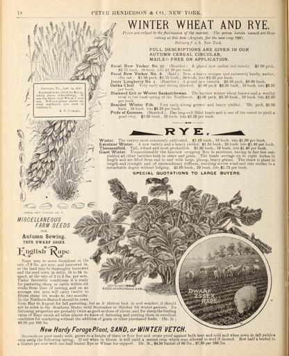 Keywords: Wholesale price list of requisites for florists and market gardeners (16775355302).jpg S ARE GIVEN IN OUR <br> AUTUMN CEREAL CIRCULAR <br> MAILED FREE ON APPLICATION <br> Rural New Yorker No 57 Bearded A grand new amber red variety 1 00 peck <br> 2 75 bush 10 bush lots 2 50 per bush <br> Rural New Yorker No 6 Bald New a heavy cropper and extremely hardy amber <br> See cut 1 00 peck 2 75 bush 10 bush lots 2 50 per bush <br> Jones' Longberry No I Hoarded A grand new variety 2 50 peek 6 00 bush <br> Oatka Chief Very early and strong strawed 1 00 petk' 3 50 bush 10 bush lots 3 25 <br> per bush <br> Diamond Grit or Winter Saskatchewan The hardest winter wheat known and a worthy <br> rival to the hard spring of the Northwest 1 00 peek 3 50 bush 10 bush lots 3 00 <br> per bush <br> Bearded Winter Fife Very early strong grower and heavy yielder 75c peck 2 50 <br> bush 10 bush lots 2 25 per bush <br> Pride of Genesee Bearded Has long well filled heads and is one of the surest to yield a <br> good crop 2 50 bush 10 bush lots 2 25 per bush <br> Winter The variety most commonly cultivated 1 10 bush 10 bush lots 1 00 per bush <br> Excelsior Winter A new variety and a heavy yielder 1 50 bush 10 bush lots 1 40 per bush <br> Thousandfold Tall robust and most productive 1 50 bush 10 bush lots 1 40 per bush <br> Giant Winter Unquestionably the heaviest cropping Rye in existence having in fair test out- <br> yielded all other varieties both in straw and grain The heads average six to eight inches in <br> length and are filled from end to end with large plump heavy grains The straw is giant in <br> length and strength and of extraordinary stiffness resisting severe wind and rain storms to a <br> remarkable degree without lodging 2 00 bush 10 bush lots 1 75 per bush <br> SPECIAL QUOTATIONS TO LARGE BUYERS <br> £r3 <br> RURAL NEW YORKER NO 6 <br> MISCELLANEOUS <br> FARM SEEDS <br> FOR <br> Autumn Sowing <br> TEDE DWAEF ESSEX <br> Rape may be sown broadcast at the <br> rate of 6 lbs per acre and harrowed in <br> or I he land may be thoroughly harrowed <br> and the seed sown in drills 18 to 24 in <br> apart at the rate of 2 to 3 lbs per acre <br> Under favorable conditions it is ready <br> for pasturing sheep or cattle within six <br> weeks from time of sowing and on an <br> average one acre will carry twelve to <br> fifteen sheep six weeks to two months <br> In the Northern States it should be sown <br> from May to August for fall pasturing but as it thrives best in cool weather it should <br> not be sown in the Southern States until September or October for winter pasture Its <br> fattening properties are probably twice as good as those of clover and for sheep the feeding <br> value of Rape excels all other plants we know of fattening and putting them in excellent <br> condition for marketing without the addition of grain or other purchased feeds 12c lb ; <br> 9 00 per 100 lbs <br> New Hardy Forage Plant SAND or WINTER VETCH <br> Succeeds on poor sandy soils grows to a height of three or four feet and seems proof against both heat and cold and when sown install yields a <br> crop early the following spring If cut when in bloom it will yield a second crop which may allowed to seed if desired <br> a bushel per acre with one half bushel Rye or Wheat for support 15c lb 4 50 bushel of 60 lbs 7 50 per 100 lbs <br> COPYH iSHT IB95BY <br> Sow half a bushel to 45172978 160879 84546 Page 18 Text http //www biodiversitylibrary org/page/45172978 1897 Henderson Peter Co ; Stumpp Walter Co New York N Y Biodiversity Heritage Library Wholesale price list of requisites for florists and market gardeners / 1897-1913 Garden Stories Catalogs Henderson Peter Co New York New York State Nurseries Horticulture Nursery stock Seed industry and trade Seeds Stumpp Walter Co New York N Y Mertz Library The New York Botanical Garden bhl page 45172978 dc identifier http //biodiversitylibrary org/page/45172978 bhlGardenStories Flowers Bulbs Rye English Rape BHLinbloom henderson peter co new york new york state nurseries horticulture stumpp walter co new york n y mertz library the new york botanical garden bhlgardenstories english rape bhlinbloom Information field Flickr posted date ISOdate 2015-03-10 CC-BY-2 0 BioDivLibrary https //flickr com/photos/61021753 N02/16775355302 2015-08-24 21 50 37 cc-by-2 0 PD-old-70-1923 Secale cereale Wholesale price list of requisites for florists and market gardeners 1897 Photos uploaded from Flickr by Fæ using a script