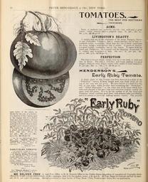 | Keywords: Wholesale price list of requisites for florists and market gardeners (16569170567).jpg PETER HENDERSON CO NEW YORK <br> TOMATOES <br> THE BEST FOR SOUTHERN <br> TRUCKERS <br> ACME <br> Early of medium size perfectly smooth very solid and a great <br> bearer Color crimson with a purplish tinge 5c pkt ; 2l c oz ¢ <br> 50c i lb ; 1 80 per lb <br> LIVINGSTON'S BEAUTY <br> A variety sent out by the originator of the Acme Paragon Favor- <br> ite and Perfection Tomatoes and is simply another one of that re- <br> markable series resembling closer than any one of those mentioned <br> the Acme being a little lighter tint of purple It grows in clusters <br> is a good yielder continuing late in the seasou It ripens with the <br> Acme and Perfection It is a good sort for shipping on account of <br> its soliditv and toughness of skin See cut 5e per pkt ; 20c <br> per oz ; 60c ± lb ; 2 00 per lb <br> PERFECTION <br> The fruit is almost round ripens clear up to the stem is solid and <br> rich in flavor The skin is both thin and tough making it a good <br> shipper while its clear bright scarlet color makes it most attractive <br> 5c per pkt ; 20c oz ; 50c ± lb ; 1 80 per lb <br> HENDERSON'S <br> A single plant of this Tomato was first observed in a field of the <br> Perfection variety it being loaded with ripe fruit while all the <br> rest of the crop was yet green We have known of a field that was <br> full of ripe fruit while another field containing the Perfection <br> and Dwarf Champion on the other side of the fence which were <br> sown and planted at the same time and otherwise treated exactly the <br> same were still green It is by far the earliest of all the large-kized <br> Tomatoes which combine good form rich crimson color and solidity <br> and it is certain to prove the leadiny market variety The peculiar <br> Livingston s kfai'ty tomato <br> open habit of the plant as <br> shown by the cut is a distinc- <br> tive feature of this variety and <br> is the reason why it is earlier <br> than any other variety the sun <br> having a better chance to reach <br> andripenthe fruit thanin more <br> upright and compact varieties <br> The engraving is taken from <br> a plant photographed in the <br> field See cut Price 5c <br> per pkt ; 20c per oz ; 60c <br> peri lb ; 2 25 per lb <br> I see by our Agricultural Paper <br> ihat your Early Ruby <br> Tomato was the earliest of q6 <br> varieties they planted Send me <br> your price S A CREEL <br> Bellevue Colo <br> EARLY RUBY TOMATO <br> OR FORCING UNDER GLASS <br> I would like to send you a picture <br> f our Early Ruby Tomato <br> in our geeennouses ; they are just <br> loaded with fruit and are of good <br> size now We never would ask for a <br> better tomato Have middle <br> benches in three greenhouses ” 166x 0 <br> tilled with them <br> M H HARRINGTON <br> Vashon Wash <br> The Early Ruby is all you <br> claim for it R T STUTT S C <br> WE DELIVER FREE to any Post Office or R R Express Office in the United States regardless of quantity all Vegetable Seeds <br> offered by weight except where noted in this catalogue that is by the packet ounce \ lb and lb If Peas Beans or Corn are desired by mail <br> add 10 cts per quart for postage Special quotations to large buyers of Peas Beans Corn Potatoes and Onion Sets on application 45172972 160879 84546 Page 12 Text http //www biodiversitylibrary org/page/45172972 1897 Henderson Peter Co ; Stumpp Walter Co New York N Y Biodiversity Heritage Library Wholesale price list of requisites for florists and market gardeners / 1897-1913 Garden Stories Catalogs Henderson Peter Co New York New York State Nurseries Horticulture Nursery stock Seed industry and trade Seeds Stumpp Walter Co New York N Y Mertz Library The New York Botanical Garden bhl page 45172972 dc identifier http //biodiversitylibrary org/page/45172972 bhlGardenStories Flowers Vegetables Tomatoes Early Ruby Tomato BHLinbloom henderson peter co new york new york state nurseries horticulture stumpp walter co new york n y mertz library the new york botanical garden bhlgardenstories early ruby tomato bhlinbloom Information field Flickr posted date ISOdate 2015-03-10 CC-BY-2 0 BioDivLibrary https //flickr com/photos/61021753 N02/16569170567 2015-08-24 21 56 51 cc-by-2 0 PD-old-70-1923 Tomatoes Wholesale price list of requisites for florists and market gardeners 1897 Photos uploaded from Flickr by Fæ using a script |