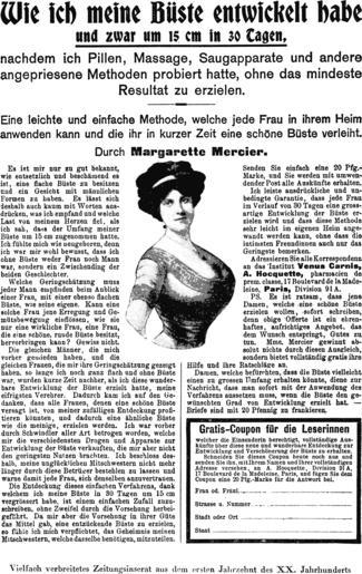| Keywords: Wie ich meineBuste entwickelt habe.gif  Wie ich meine Büste entwickelt habe und zwar um 15 cm in 30 Tagen nachdem ich Pillen Massage Saugapparate und andere angepriesene Methoden probiert hatte ohne das mindeste Resultat zu erzielen Eine leichte und einfache Methode welche jede Frau in ihrem Heim anwenden kann und die ihr in kurzer Zeit eine Schöne Büste verleiht Durch Margarette Mercier Es ist mir nur zu gut bekannt wie entsetzlich und beschämend es ist eine flache Büste zu besitzen und ein Gesicht mit männlichen Formen zu haben Es lässt sich deshalb auch kaum mit Worten aus- drücken was ich empfand und welche Last von meinem Herzen fiel als ich sah dass der Umfang meiner Büste um 15 cm zugenommen hatte Ich fühlte mich wie neugeboren denn ich war mir wohl bewusst dass ich ohne Büste weder Frau noch Mann war sondern ein Zwischending der beiden Geschlechter Welche Geringschätzung muss jeder Mann empfinden beim Anblick einer Frau mit einer ebenso flachen Büste wie seine eigene Kann eine solche Frau jene Erregung und Ge- mütsbewegung einflössen wie sie nur eine wirkliche Frau eine Frau die eine schöne runde Büste besitzt hervorbringen kann Gewiss nicht Die gleichen Männer die mich Vorher gemieden haben und die gleichen Frauen die mir ihre Geringschätzung gezeigt haben so lange ich noch ganz flach und obne Büste war wurden kurze Zeit nachher als ich diese wunder ¢ bare Entwicklung der Büste erzielt hatte meine eifrigsten Verehrer Dadurch kam ich auf den Ge-danken dass alle Frauen denen eine schöne Büste versagt ist von meiner zufälligen Entdeckung profi- tieren könnten und dadurch eine ähnliche Büste wie die meinige erzielen werden Ich war vorher durch Schwindler aller Art betrogen worden welche mir die verschiedensten Drogen und Apparate zur Entwicklung der Büste verkauften die mir aber nicht den geringsten Nutzen brachten Ich beschloss des-halb meine unglücklichen Mitschwestern nicht mehr länger durch diese Betrüg er bestehlen zu lassen und warne damit jede Frau sich denselben anzuvertrauen Die Entdeckung dieses einfachen Verfahrens dank welchem ich meine Büste in 30 Tagen um 15 cm vergrössert habe ist einem einfachen Zufall zuzu- schreiben ohne Zweifel durch die Vorsehung herbei- geführt Da mir aber die Vorsehung in ihrer Güte das Mittel gab eine entzückende Büste zu erzieien so fühle ich mich verpflichtet das Geheimnis meinen Mitschwestern welche dasselbe benötigen mitzuteilen Senden Sie einfach eine 20 Pfg - Marke und Sie werden mit umwen- dender Post alle Auskünfte erhalten Ich leiste ausdrückliche und un-bedingte Garantie dass jede Frau im Verlauf von 30 Tagen eine gross-artige Entwicklung der Büste er- zielen wird und dass diese Methode sehr leicht im eigenen Heim ange- wandt werden kann ohne dass die intimsten Freundinnen auch nur das Geringste bemerken A dressieren Sie alle Korrespondenz an das Institut Venus Carnis A Hocquette pharmacien de prem classe 17 Boulevard de la Made- leine Paris Division 91 A PS Es ist ratsam dass jene Damen welche eine schöne Büs te erzielen wollen sofort schreiben denn obige 'Offerte ist ein ehren- haftes aufrichtiges Angebot das dem Wunsch entspringt Gutes zu tun Mme Mercier gewinnt ab- solut nichts durch diesen Ausgleich sondern bietet vollständig gratis ihre Hilfe und ihre Ratschläge an Damen welche befürchten dass dis Büste vielleicht einen zu grossen Umfang erhalten könnte diene zur Nachricht dass man sofort mit der Anwendung des Verfahrens aussetzen muss wenn die Büste den ge- wünsch ten Grad von Entwicklung erzielt hat Briefe sind mit 20 Pfennig zu frankieren Gratis-Coupon für die Leserinnen welcher die Einsenderin berechtigt vollständige Auskünfte über diese neue und wanderbare Entdeckung zur Entwicklung und Verschönerung der 8üste Zu erhalten Schneiden Sie diesen Cou on heute noch aus und senden Sie ihn mit Ihrem Namen und Ihrer vollständigen Adresse versehen an A Hocquette Division 91 A 17 Boulevard de la Madeleine Paris und fügen Sie dem Coupon eine 20 Pfg -Marke f ür die Antwort bei Frau od Fräul Strasse u Nummer Stadt oder Ort Staat Vielfach verbreitetes Zeitungsinserat aus dem ersten Jahrzehnt des XX Jahrhunderts Sittengeschichte des Intimen page 115 PD-old Chest expanders History of brassieres Transcutaneous electrical nerve stimulation |