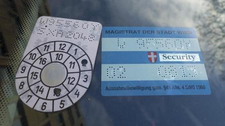 Keywords: Wien 00 Parkpickerl 03.jpg Begutachtungsplakette und Parkpickerl auf einer Windschutzscheibe in Wien 2 own Gugerell 2013-03-04 48 218511 16 372558 region AT-9 Road transport in Austria Images by Peter Gugerell Vienna Cc-zero