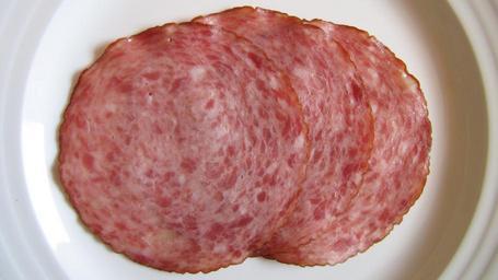 Keywords: Wiener Wurst slices.jpg en Three slices Wiener Wurst Sold under the name Tiroler-Salami Wiener Wurst Vermarktet unter dem Namen Tiroler-Salami own LordOider 2014-04-17 Sausages of Austria Cc-zero