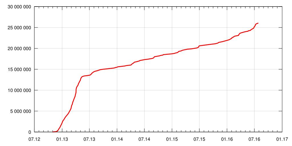 | Keywords: Wikidata item creation progress no text.svg recent en Plot of item creation by date for Wikidata Source Version history got over API de Plot der Entwicklung der Datenobjektzahlen auf Wikidata Quelle Versionsgeschichte über API abgerufen pt Gráfico que ilustra a criação de itens por data no Wikidata ru Г афик оста числа элементов Викиданных по дате Источник Исто ия ве сий получена че ез API own Pyfisch 2013-04-11 other fields Gnuplot + // Gnuplot plt file Update xrange and yrange if necessarry set term svg size 1000 500 fname 'Helvetica' fsize 16 set grid xtics ytics lt 1 lc rgb 0xAAAAAA lw 5 set xdata time set timefmt Y- m- dT H M SZ set format x m y set format y 6 0f set output wikidata_growth svg plot ausgabe using 1 2 title with lines lw 3 lc 'red'; syntax2 text none Gnuplot data // Used by Gnuplot updated if needed Date Numer of Elements 2012-10-29T18 18 48Z 1 2012-11-24T10 54 38Z 100000 2012-11-29T15 11 16Z 200000 2012-12-02T17 12 35Z 300000 2012-12-05T04 00 21Z 400000 2012-12-07T10 55 26Z 500000 2012-12-08T18 14 00Z 600000 2012-12-10T02 01 49Z 700000 2012-12-12T05 06 56Z 800000 2012-12-15T21 17 13Z 1000000 2012-12-17T14 55 14Z 1100000 2012-12-19T10 34 26Z 1200000 2012-12-20T15 12 10Z 1300000 2012-12-21T16 45 26Z 1400000 2012-12-23T00 14 52Z 1500000 2012-12-24T08 09 36Z 1600000 2012-12-25T22 58 04Z 1700000 2012-12-27T19 15 20Z 1800000 2012-12-28T21 15 33Z 1900000 2012-12-29T23 08 12Z 2000000 2012-12-31T05 12 29Z 2100000 2013-01-01T18 11 50Z 2200000 2013-01-02T19 21 33Z 2300000 2013-01-03T14 44 38Z 2400000 2013-01-04T13 38 43Z 2500000 2013-01-05T16 06 58Z 2600000 2013-01-09T19 01 39Z 2800000 2013-01-11T23 14 34Z 2900000 2013-01-13T22 17 57Z 3000000 2013-01-15T09 49 12Z 3100000 2013-01-17T03 10 52Z 3200000 2013-01-20T11 15 27Z 3400000 2013-01-24T03 49 32Z 3600000 2013-01-26T11 20 42Z 3700000 2013-01-28T19 09 49Z 3800000 2013-01-30T20 02 54Z 3900000 2013-02-02T06 54 04Z 4000000 2013-02-04T14 53 44Z 4100000 2013-02-07T08 24 52Z 4200000 2013-02-09T03 03 07Z 4300000 2013-02-11T04 12 26Z 4400000 2013-02-14T17 16 36Z 4600000 2013-02-15T23 55 37Z 4700000 2013-02-17T09 00 18Z 4800000 2013-02-19T02 41 51Z 4900000 2013-02-20T18 29 20Z 5000000 2013-02-22T07 13 15Z 5100000 2013-02-23T20 02 00Z 5200000 2013-02-25T03 51 01Z 5300000 2013-02-26T19 10 45Z 5400000 2013-02-27T22 54 48Z 5500000 2013-03-01T04 18 06Z 5600000 2013-03-02T01 43 16Z 5700000 2013-03-02T14 08 09Z 5800000 2013-03-03T04 04 28Z 5900000 2013-03-03T17 08 47Z 6000000 2013-03-04T05 42 17Z 6100000 2013-03-04T23 55 52Z 6200000 2013-03-05T17 03 37Z 6300000 2013-03-06T14 09 28Z 6400000 2013-03-08T01 44 00Z 6500000 2013-03-09T23 09 51Z 6600000 2013-03-11T09 41 21Z 6800000 2013-03-12T13 02 21Z 7000000 2013-03-13T06 28 51Z 7100000 2013-03-14T00 52 59Z 7200000 2013-03-15T06 01 24Z 7300000 2013-03-17T19 43 30Z 7500000 2013-03-18T14 15 36Z 7600000 2013-03-19T10 28 48Z 7700000 2013-03-20T18 15 50Z 7800000 2013-03-21T17 08 49Z 7900000 2013-03-22T14 18 16Z 8000000 2013-03-23T16 42 21Z 8100000 2013-03-24T23 13 36Z 8200000 2013-03-26T06 59 37Z 8300000 2013-03-27T07 28 12Z 8400000 2013-03-28T05 45 21Z 8500000 2013-03-29T03 35 20Z 8600000 2013-03-29T16 37 07Z 8700000 2013-03-30T04 58 23Z 8800000 2013-03-30T18 43 55Z 8900000 2013-03-31T11 07 42Z 9000000 2013-04-01T02 15 00Z 9100000 2013-04-02T00 49 16Z 9200000 2013-04-03T14 14 14Z 9400000 2013-04-03T18 50 02Z 9500000 2013-04-03T23 03 03Z 9600000 2013-04-04T05 01 44Z 9800000 2013-04-04T06 23 46Z 9900000 2013-04-04T07 46 41Z 10000000 2013-04-04T09 47 36Z 10100000 2013-04-04T11 45 41Z 10200000 2013-04-04T23 36 49Z 10300000 2013-04-05T17 34 08Z 10400000 2013-04-06T08 46 06Z 10500000 2013-04-08T06 50 59Z 10700000 2013-04-09T17 10 21Z 10800000 2013-04-17T01 23 38Z 11200000 2013-04-17T21 45 00Z 11300000 2013-04-18T20 45 32Z 11400000 2013-04-19T14 47 31Z 11500000 2013-04-20T12 19 15Z 11600000 2013-04-21T13 58 43Z 11700000 2013-04-24T02 22 47Z 11800000 2013-04-25T14 51 16Z 11900000 2013-04-26T08 49 37Z 12000000 2013-04-29T11 23 42Z 12200000 2013-05-01T12 35 41Z 12300000 2013-05-02T12 55 20Z 12400000 2013-05-03T10 14 03Z 12500000 2013-05-04T00 23 54Z 12600000 2013-05-04T17 15 56Z 12700000 2013-05-05T13 29 42Z 12800000 2013-05-08T23 50 55Z 13000000 2013-05-11T07 25 43Z 13100000 2013-05-13T11 10 01Z 13200000 2013-05-18T17 14 03Z 13300000 2013-05-27T16 39 21Z 13400000 2013-06-19T08 29 13Z 13500000 2013-07-04T07 21 11Z 13600000 2013-07-10T02 58 26Z 13700000 2013-07-12T04 15 59Z 13800000 2013-07-15T00 58 44Z 13900000 2013-07-16T23 59 31Z 14000000 2013-07-19T21 29 34Z 14100000 2013-07-23T20 31 09Z 14200000 2013-07-26T15 07 17Z 14300000 2013-07-31T22 17 23Z 14400000 2013-08-06T00 44 06Z 14500000 2013-08-16T18 03 55Z 14600000 2013-08-27T15 20 17Z 14700000 2013-09-03T12 53 40Z 14800000 2013-09-11T12 42 28Z 14900000 2013-09-30T05 53 10Z 15000000 2013-10-25T09 47 43Z 15100000 2013-11-17T23 42 21Z 15200000 2013-12-11T20 57 13Z 15300000 2013-12-21T04 23 13Z 15400000 2014-01-01T08 53 03Z 15500000 2014-01-07T08 53 41Z 15600000 2014-02-01T14 45 28Z 15700000 2014-02-23T05 20 32Z 15800000 2014-03-06T13 39 44Z 15900000 2014-04-01T14 42 55Z 16000000 2014-04-06T21 56 27Z 16100000 2014-04-08T09 49 24Z 16200000 2014-04-11T23 50 47Z 16300000 2014-04-20T20 12 23Z 16500000 2014-04-23T15 44 59Z 16600000 2014-04-26T16 50 24Z 16700000 2014-05-09T23 22 14Z 16800000 2014-05-29T18 38 43Z 17000000 2014-06-02T03 10 34Z 17100000 2014-06-16T14 50 31Z 17200000 2014-07-01T00 22 14Z 17300000 2014-07-22T19 51 49Z 17400000 2014-08-24T15 35 30Z 17600000 2014-08-30T14 12 35Z 17700000 2014-09-02T11 04 40Z 17800000 2014-09-07T00 37 32Z 18000000 2014-09-21T17 12 01Z 18100000 2014-10-09T08 33 10Z 18200000 2014-10-16T19 53 53Z 18300000 2014-11-01T10 22 54Z 18400000 2014-11-05T05 08 05Z 18500000 2015-01-01T10 32 30Z 18700000 2015-01-17T04 42 59Z 18800000 2015-01-26T06 02 39Z 18900000 2015-02-07T01 42 42Z 19000000 2015-02-10T06 30 18Z 19100000 2015-02-12T13 08 22Z 19200000 2015