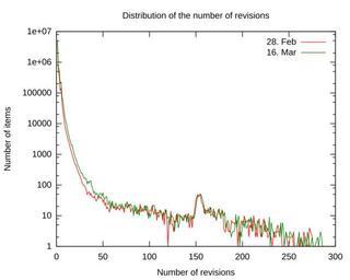 Keywords: Wikidata-revisionsperitem.svg de Verteilung der Anzahl von Versionen Bearbeitungen pro Seite in Wikidata Stand siehe Beschreibung own Michael F Schönitzer 2013-03-11 Cc-zero Work by Michael Schönitzer Wikidata statistics