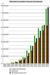 | Keywords: Wikimedia Foundation financial development multilanguage.svg translate yes Financial development of the Wikimedia Foundation legend green Support and Revenue red Expenses black Net assets at year-end Dévelopement financier de la Wikimedia Foundation Légende green Revenus red Dépenses black Avoirs nets à la fin de l'année own As upload date Sameboat File Wikimedia Foundation financial development png File Wikimedia Foundation financial development 2003-2012 de png Graphical details Each 10 million is 75 px high Due to the inaccuracy of extreme scaling overflow of extreme scaling value the actual path height value of the bar must be divided by 10000000 10m e g 75 797 223 becomes 75 797223 it is then multiplied by 1 -7 5 via SVG transform Cc-zero Wikimedia statistics Wikimedia fundraising analysis |